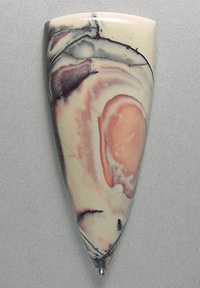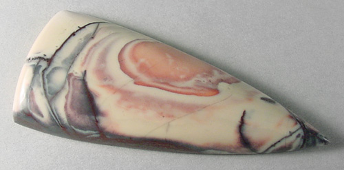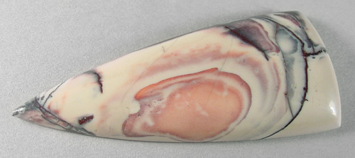 Offered here is a cabochon of porcelain jasper from Mexico, called Exotica. This cabochon features an intriguing pattern in purple and pinkish-red tones against a rich creamy old ivory background. I always most favor those examples that show the rippled bullseye patterns, like this one, with its one large 'eye'. Added to bold lightning strokes going every which way, as well as some streaks of maroon and a darkly shiny sub-metallic, it's a very cool stone with boatloads of designer potential. Folks just love the stuff, and I think you will too. In case you're unsure, there are no fractures present; any odd lines are simply part of the figure, as formed. This cab has a well rounded dome of 6mm, a designer 'spear' shape, and a fine glossy polish both front and back.
