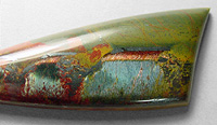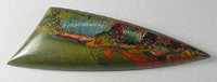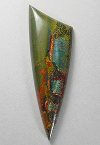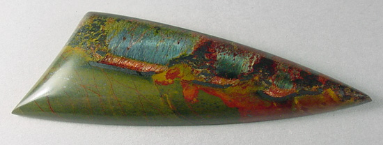 Offered here is an amazing cabochon of genuine Marra Mamba tigereye, a highly collectible old stock rarity from Australia. This startling material is, hands down, the most outrageous tigereye ever found, and this gem is a delightful example. It features at least three pools of shimmering pearly chatoyance in teal blue that rolls and flashes through the stone. At the edge of the blue areas is a bold stripe of velvety chatoyant orange and a stripe of shiny metallic hematite. The body of the stone is composed of unusually colorful jasper, in olive green and gold shades, with splashes and streaks of orange and blood red. There are several knots and patches of gleaming hematite (one of which closely mimics a tiny branching tree!), sub-metallic matrix, and scattered freckles of both. YUM! This cab has a high rounded dome of 6+mm, a bold designer 'spear' shape, and an extra smooth, glassy polish both front and back.