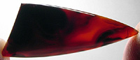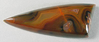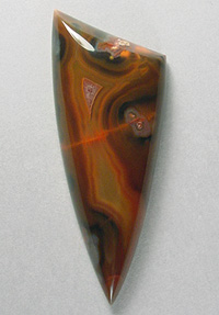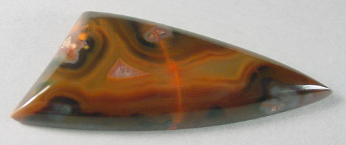 Offered here is a cabochon of colorful Condor agate, from Patagonia. The appealing hues of this stone are dandy, but that doesn't tell the whole story here; there's so much more going on in it, including ringed tubes, odd plumes, bright orange lightning bolts, fortification banding, and a crystalline core that sparkles like crushed ice. And yes, of course, it also has that rich, warm glow that is so unmistakeably Condor agate! There's just nothing else like it. Set this beauty in either gold or silver, and you'll have a real showpiece to be proud of, no doubt! The cab has a very high rounded dome of 7mm, a bold designer shape, and a gleaming polish both front and back.