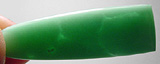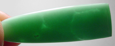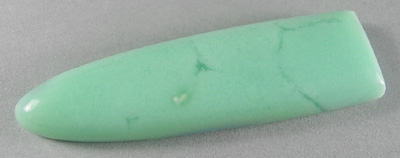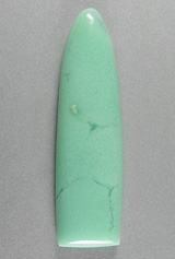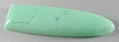 Offered here is a remarkable cabochon of Australian Offered here is a cabochon of Australian chrysoprase from a newly discovered find near Yerilla, Australia. Like the old Marlboro material, it's a valuable chalcedony colored a beautiful icy green pastel by the presence of nickel. This particular example is only somewhat translucent, with faint threads of a deeper green adding to the visual interest. The stone has a high rounded dome of nearly 6mm, a designer 'bullet' shape, and a smooth glassy polish both front and back.