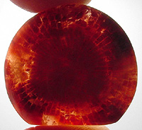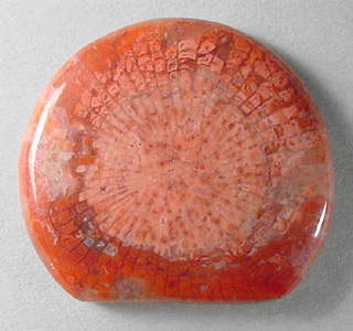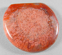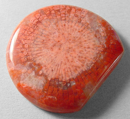 Offered here is a magnificent cabochon of fossilized horn coral, from Utah. Horn corals are actually ancient sea life, and you can clearly see the organic nature of this once-living coral in the highly translucent agate. It has the classic 'radiating spoke' figure, in coral pink and red. A close look reveals it also has some neat fortifications and teensy bullseye patterns, as well as odd bits of agate beneath the surface. Nicely translucent too, shown off in an extra large size with a half moon shape. Front and center for this one! The stone has a low rounded dome of nearly 5mm, and a fine glassy polish both front and back.