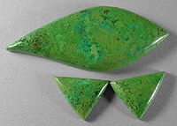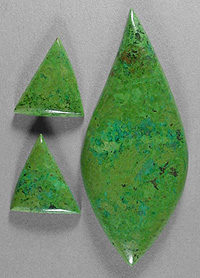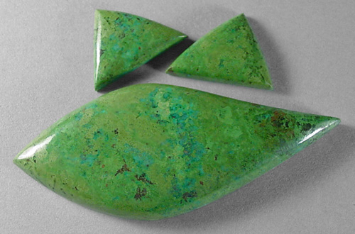 Offered here is a matching set of three cabochons, cut from premium old stock parrot wing jasper, from Mexico. This delightful jasperized chrysocolla is becoming very difficult to find, and spendy too, unlike the more common copper complexes so often substituted for it and erroneously dubbed 'parrot wing'. These are the real deal, folks. These unique beauties have VIVID lime greens, with a blush of turquoise blue, and tiny flecks of brown. The striking greens very much remind me of gaspeite, and they are every bit as vibrant as the photos depict, perhaps even moreso. I really enjoy cabbing this classic material for use in my own jewelry; it's beautifully colored, very solid, and there's seldom any difficulty achieving a slick, glassy shine. The largest stone has a well rounded dome of 5.5mm, and the smaller pair are 3mm in thickness, each with a smooth glossy polish both front and back.