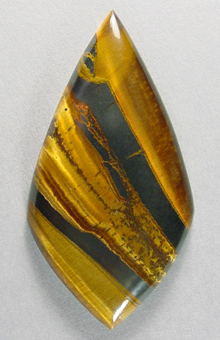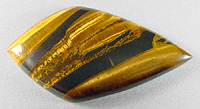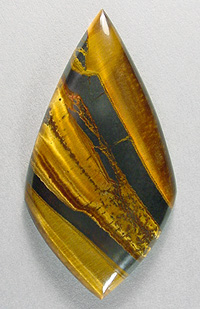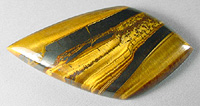 Offered here is a cabochon of picture tigereye, which hails from Africa. This fun and unusual material has row upon row of dancing golden yellow chatoyance, with the extra added bonus of dark silver bands of hematite running through it. The contrast is a really nice twist on the classic old favorite tigereye. The stone has a high rounded dome of 6mm, a crisp shape, and a great glassy polish both front and back.