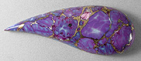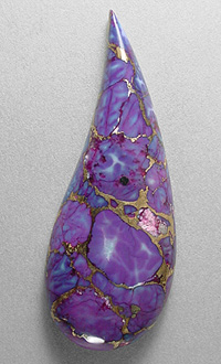 Offered here is a cabochon of Mohave purple turquoise. My cousin purchased a large block of this vividly colored material from the nice folks who mine Kingman turquoise in Arizona. It is composed of small nuggets of natural blue turquoise, to which they added red dye and a brassy-bronze metallic. From there, I'm told the proprietary process is very much the same as with other stabilized turquoise, using a combination of heat and compression, and this is the end result. Bright, beautiful coloration, with contrasting golden metallic webbing through and through. Flecks of silvery pyrite, too. Even though this purple turquoise isn't natural, either in color or form, I find it to be absolutely gorgeous. It cut like a dream, took a fantastic polish, and is totally solid. And that extraordinary color certainly grabs everyone's attention! The cab has a high rounded dome of 7mm, and a fun designer shape, smoothly polish front and back.