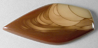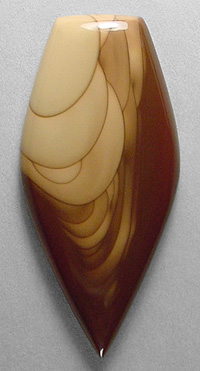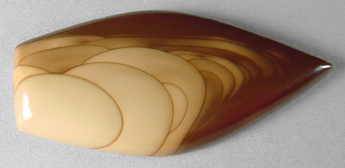 Offered here is a splendid cabochon of Bruneau Canyon jasper, from Idaho. It features an outstanding pattern of half orbs, one in front of the other, in shades of buckskin. The orbs contrast nicely against a deep brownish-burnt orange background. Sadly, the best of this hard porcelain-like jasper has become alarmingly scarce and spendy these days, and the claim owner tells me the access route is extremely difficult terrain. And that's before he even gets down to the truly hard work of mining. Bruneau jasper remains a classic favorite, and I love the stuff! It takes an outrageously glassy polish, and when it's beautifully patterned like this cab is, it is sought after by collectors and designers alike. The stone has a high rounded dome of 6mm, a versatile designer shape, and a brilliantly glassy polish both front and back.