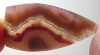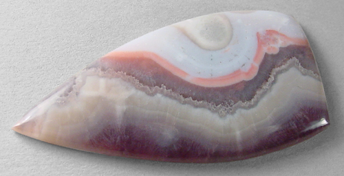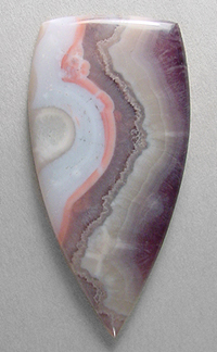 Offered here is a lovely cabochon of amethyst lace agate, from Mexico. Seldom seen, this old timey agate has become most difficult to obtain these days. Not to be confused with the more recent chevron amethyst lace of (much) lesser quality. This cab is a nicely translucent example, with attractive pink, purple and lavender bands, with white & gray. The dark amethyst area appears to have very fine sagenitic needles. The cab has a low dome of 4mm, a sleek designer 'spearhead' shape, and a super glassy polish both front and back.