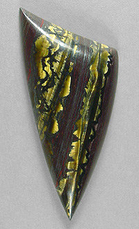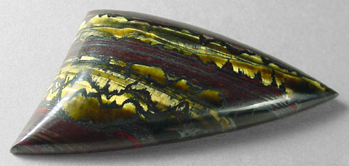 Offered here is a cabochon of Australian tigeriron. This example was cut from hand selected material, chosen especially for its bright gleaming patches of chatoyant golden tigereye. The stone also includes thin threads of red jasper and ribbons of dark silvery metallic hematite both separating and framing the gold 'windows'. The contrast is exceptional. The cab has a crisp designer shape, a very high rounded dome of nearly 7mm, and it is beautifully polished both front and back.