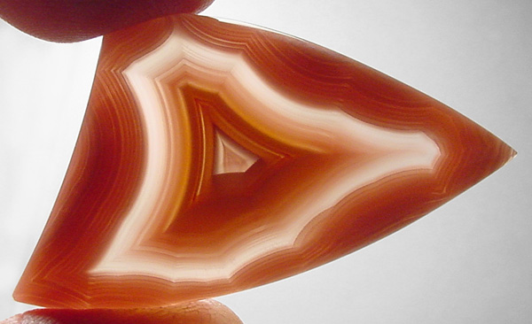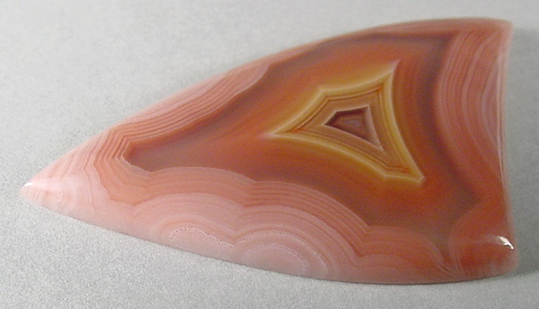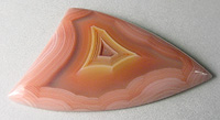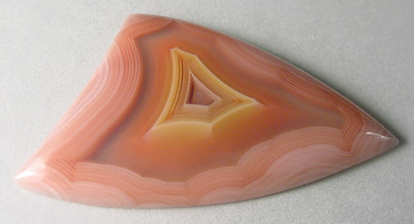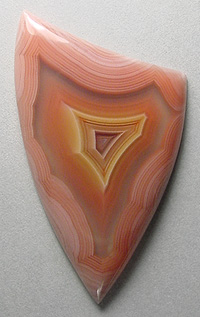 Offered here is a collector's cabochon of Laguna agate, from Mexico. This magnificent gemmy example was cut from the heart of a prized old stock nodule, showing absolutely delicious peachy pink coloration. There's a gorgeous floating core of orange and yellow fortification bands, framed with a wide clear band, which is in turn surrounded by razor fine banding. This is a true shadow agate, with parallax. Check out the backlit photo enlarged, it's simply AWESOME!! Whether as an addition to your collection, or set for everyday wear, this one's a knockout cab you'll be most proud to own!! It has a well rounded dome of 5mm, a bold designer shape, and a slick glassy poish both front and back.