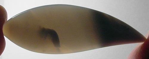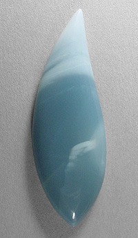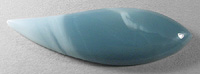 Offered here is a cabochon of blue opal, from Oregon's Succor Creek formation, at the edge of the Owyhee breaks. Even though it has no fire, I really hesitate to call it 'common opal', because it's certainly anything BUT common. It has a super-saturated blue hue that's to-die-for gemmy, with some subtle lighter clouds and streaks. No cracks! It's always surprising to see that this strongly colored stone is very translucent, even when indirectly backlit. And it's amazing to see how light passing through the stone transforms its blue hues so completely. It should be equally beautiful in gold or silver jewelry, no doubt, or it would make a fine addition to any collection. The stone has a well rounded dome of 5mm, an sweet designer shape, and a totally glassy polish both front and back.