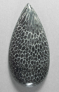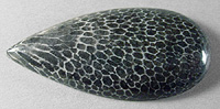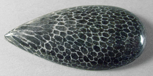 Offered here is a cabochon of fossilized bryzoa, a material recently imported from Indonesia. Similar to fossil corals, bryzoans are ancient sea creatures that lived in colonies, and secreted a hard tube-like skeleton. The individual tubes in which they lived are still quite apparent in the black and white pattern of this stone. Fascinating to be able to see what these once living colonies left behind, millions of years later! This cab has a high rounded dome of 6mm, and a smooth glassy polish both front and back.