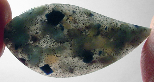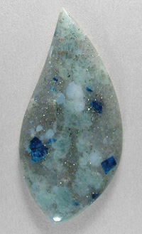 Offered here is an extraordinary cabochon cut from rare lazulite in quartzite, premium lapidary material from Georgia's renown Graves Mountain area. This example features light blue patches and dark royal blue lazulite crystals, though few show much of their typical dipyramidal form. The grayish quartzite base has a nice degree of translucence, and contains a multitude of silvery pyrite flecks that sparkle like glitter, though my camera captured only a hint of them. If you like featuring the truly unusual in your creations, you're going to love this stone! It has a low rounded dome of 4mm, a plump designer 'flame' shape, and a slick glassy polish both front and back.