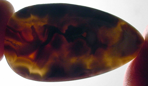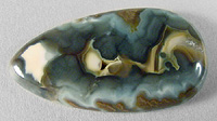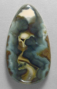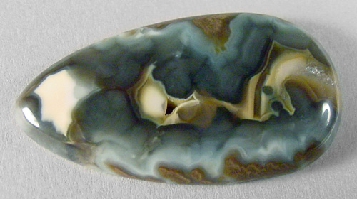 Offered here is a splendid cabochon of top quality Tahoma jasper, from the slopes of Mt. Rainier in Washington state. The local American Indian name for that same mountain is Tahoma, which translates roughly to 'next to heaven', and it is considered to be a sacred place. So someone chose a great name for this terrific and very rare material! This unique cab is a marvelous example, with intriguing squiggles of agate, feathery clouds, gemmy yellow chiffon pools and even subtle fortifications. The colors are typical of the best the material has to offer, with several shades of light and dark slate blue, burnt yellow, cream and charcoal. Rusty brown matrix forming plume-like figures at two sides, an open void adding to the character, and a sparkly crystalline area at the wide end. Great contrast here, and because it's a mixture of agate and jasper, there's more than a little translucence present too. This stone has next to none of the all too typical fractures, and whatever few tiny lines that may be present are quite well healed. The stone has a low rounded dome of 5mm, and an ovoid shape, brilliantly polished both front and back.