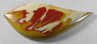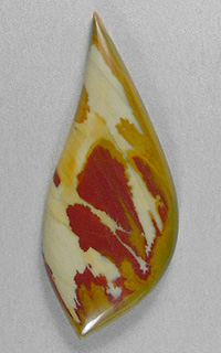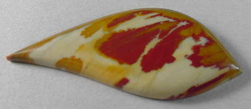 Offered here is a striking cabochon of Owyhee jasper, from Oregon, cut by my son Christopher. Technically, this jasper is actually a rarer greenish sub-variety known as war bonnet or pea jasper, but a few slices of the rough had this more typically colored area. The resulting stone has an almost painted pattern of red plumes and orange splashes which stand out strongly against a lemon chiffon background. At bit of the greenish hues can be seen at one edge. This classic treasure is sure to spark your imagination if anything will. The stone has a well rounded dome of 5mm, a designer 'flame' shape, with a slick glassy polish. The back is sanded smooth but unpolished.