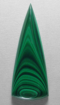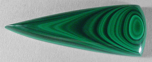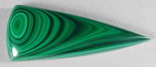 Offered here is a cabochon of malachite, from Zaire. It features the classic beauty of countless fine bandings in rich, vividly contrasting shades of light and dark green. It's a unique example of bullseye malachite, sure to look absolutely magnificent set in either silver or gold, no doubt. The cab has a well rounded dome of 5mm, a bold designer 'spear' shape, with a super glossy polish both front and back.