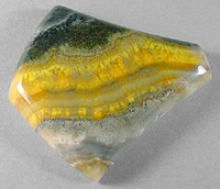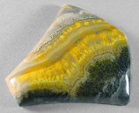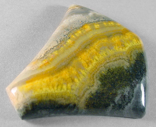 Offered here is a striking cabochon of bumble bee stone, recently imported from Indonesia. After slicing some of this extraordinary material in my slab saw, it doesn't seem hard enough to be either a jasper or an agate. Once polished, it has a somewhat waxy feel, a lot like onyx does. For sure, it cuts FANTASTIC cabs! In this example, the brilliant yellow bands seem to have a hint of velvety chatoyance. The vivid colors really catch the eye, contrasting stongly with the black at one side and the gray and lemony gel area at the other. I read on the importer's website that this material is harvested near the steaming calderas of Mount Papandayan, an active volcano, where locals collect native sulfur! So that seems to explain the vivid yellow colors. Whatever it turns out to be, I think this new bumble bee 'jasper' has great designer potential! The cab has a high rounded dome of 6.5mm, a bold designer shape, and a slick glossy polish both front and back.