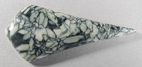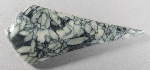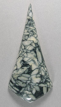 Offered here is a cabochon of pinolith, from a small manganese quarry in Austria's Turen Mountains. I really like the absract flower-petal patterns in this unusual material, outlined in black. I'm told pinolith is quite rare, and have seen a few small slabettes sell for ridiculously high prices. Its hardness is rather on the softer side, very much like crinoid marble, though I don't imagine that'll pose any problem in most jewelry. The stone has a rounded dome of 5mm, and an elegant designer shape, nicely polished both front and back.
