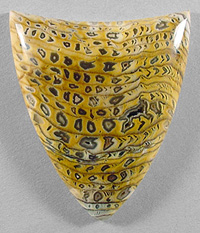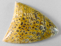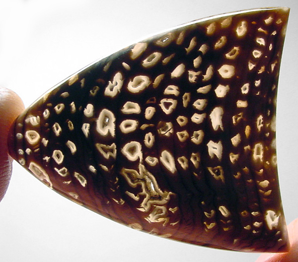 Offered here is an extraordinary collector's cabochon of petrified wood, an unsual and rare form from Hell's Canyon near the Idaho/Oregon border. (Read more about it on my blog.) The species is said to be sequoia, showing fascinating wavy annual growth lines in a herringbone pattern. This example has an amazing grain pattern, riddled with ornately shaped agate pools & holes, each of which is lined with translucent quartz, milky agate, or (common) opal. They resemble tiny embedded thundereggs, each one with its own unique shape, showing fancy fortifications. A few of the largest penetrate clear through to the backside. It is positively STUNNING backlit! And I'm fairly sure there is some super tiny crystal growth inside the tubes. Be sure to click to enlarge the photos to see the details. I'm no expert on pet wood, but this material seems opalized to some degree, and it certainly is GORGEOUS! Reminds me of howardite, what do you think? This showpiece cab has a high, well rounded dome of 6.5mm, a designer 'chevron' shape, and a slick glassy polish both front and back.