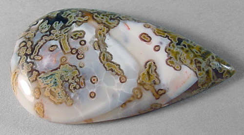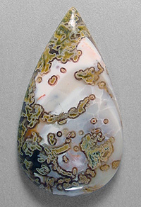 Offered here is an unusual cabochon of Priday tube agate, from the famous thunderegg digs in Oregon. This intriguing stone has a variety of intricate plumy tubes running through milky common opal that has just a hint of palest pink and some interesting craquelure figure. Toward the edges there are small patches of orange and black agate, as well as smoky haloes around each tube. The cab has a high rounded dome of 6mm, a versatile teardrop shape, and a great glassy polish both front and back.