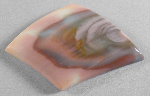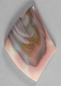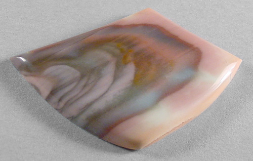 Offered here is a cabochon of Imperial jasper, from Mexico. Chris cut this 'ojitos' jasper (ojitos means little eyes in Spanish), and I think he did a fine job. It has a ripple pattern and some unusual bluish clouds overlaid on pink, rose and blue grays. Plus more typical shades of mauve & more! The stone has a low rounded dome, a crisp designer shape, and a super glassy polish both front and back.