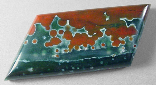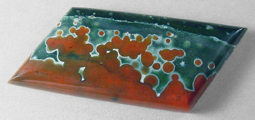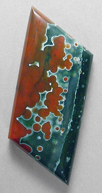 Offered here is a striking cabochon of ocean jasper, from Madagascar. This particluar ocean jasper is quite unique, with a fascinating contrast of red and green orbs, each color at its respective end. The gemmy green is semi-translucent, closer to agate than jasper. With these brilliantly vivid Christmas colors (ho ho ho!), I have little doubt this is one you're sure to treasure! The cab has a nicely rounded dome of 5mm, a crisp designer shape, and a super glassy polish both front and back.