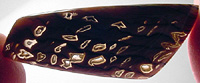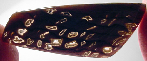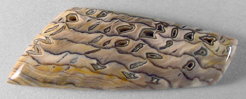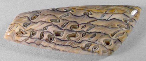 Offered here is a cabochon of petrified wood, an unsual and rare form from Hell's Canyon near the Idaho/Oregon border. (Read more about it on my blog.) The species is said to be sequoia, showing fascinating wavy annual growth lines. This richly colored example has great contrasting grain, as well as an amazing pattern of ornately shaped agate pools & voids, the largest of which are open through to the backside. The holes are lined with translucent agate or (common) opal, resembling tiny thundereggs, complete with fortifications. Some even appear to have tiny druzy crystals! Be sure to click to enlarge the photos to see the details, especially the backlit pic. I'm no expert on pet wood, but this material seems opalized to some degree, and it certainly is GORGEOUS! This cab has a nicely rounded dome of 5mm, a versatile designer shape, and a slick glassy polish both front and back.
