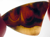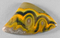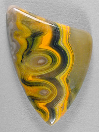 Offered here is a large, striking cabochon of bumble bee stone, recently imported from Indonesia. After slicing some of this extraordinary material in my slab saw, it simply isn't hard enough to be either a jasper or an agate. Once polished, it has a somewhat waxy feel, a lot like onyx does. For sure, it cuts FANTASTIC cabs! This example has some gorgeous bullseyes, brilliant yellow to yellow-orange bands alternating with black bands, which add an appealing contrast. Most of the stone is surprisingly translucent, and some areas show just a hint of velvety chatoyance. I read on the importer's website that this material is harvested near the steaming calderas of Mount Papandayan, an active volcano, where locals collect native sulfur! So that seems to explain the vivid yellow and yellow-orange colors. Whatever it turns out to be, I think this new bumble bee 'jasper' has tremendous designer potential! The cab has a high rounded dome of 6mm, a bold designer shape, and a slick glossy polish both front and back.