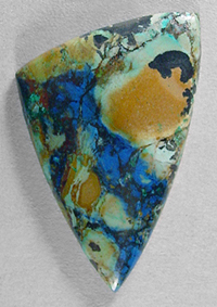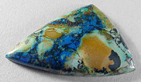 Offered here is a remarkable cab of azurite / chrysocolla, from Arizona. This striking stone has deep royal blue, pale turquoise blues & greens, with patches of tan and black. Can you see the little bear? All 100% natural, naturally hard and durable, NOT dyed or treated in any way. In my own jewelry, such bright and colorful chrysocollas just about fly out the door, so I encourage you to try some yourself. Surely you can find the perfect way to feature this attractive stone in your own creations. The cab has a well rounded dome of 5.5mm, a designer spear shape, nicely polished both front and back.