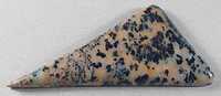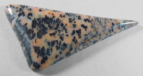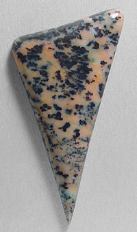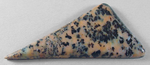 Offered here is a cabochon of cheetah agate, a fairly new material that hails from Brazil. Apparently, this agate is a by-product of an apatite mining operation. This example has a great display of blackish dendrites against a background of orange chiffon. It is semi- translucent, and unlike some that I've seen, the pattern is fairly clear rather than overly busy and muddy. It should be a breeze to turn it into an item of wearable art you'll be proud of. The cab has a well rounded dome of 5mm, a bold designer spear shape, and a slick glassy polish both front and back.