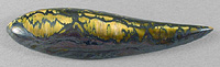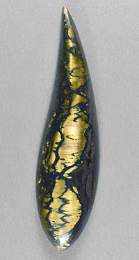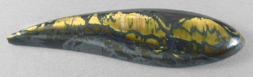 Offered here is a fancy cabochon of tigeriron, from Australia. This stone has wide strips of flashy gold chatoyant tigereye, framed by thin ribbons of dark silvery metallic hematite. Very little jasper here, but you won't miss it a bit. It's a striking example, one you may want to keep for your very own. It will turn heads wherever it goes! The stone has a gracefully curved designer shape, and a well rounded dome just shy of 6mm, nicely polished both front and back.