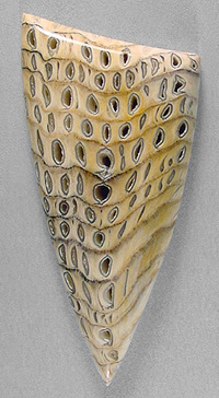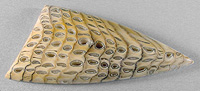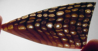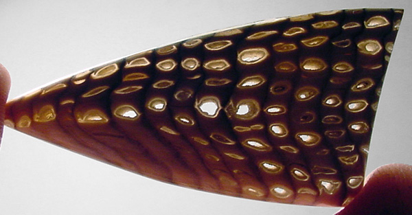 Offered here is a cabochon of petrified wood, an unsual and rare form from Hell's Canyon near the Idaho/Oregon border. (Read more about it on my blog.) The species is said to be sequoia, showing fascinating wavy annual growth lines in a herringbone pattern. This example has great contrasting lines, as well as an amazing pattern of tiny holes, lined with translucent quartz or (common) opal. They look a lot like tiny thundereggs, with no two exactly alike, even showing fortifications. Be sure to click to enlarge the photos to see the details, especially the backlit pic. I'm no expert on pet wood, but this material seems opalized to some degree, and it certainly is GORGEOUS! Reminds me of howardite, what do you think? This showpiece cab has a nicely rounded dome of 6mm, a crisp designer 'spear' shape, and a slick glassy polish both front and back.