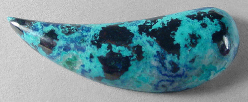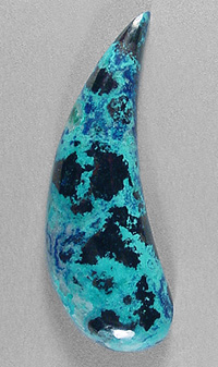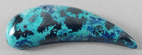 Offered here is a cabochon of rare blended shattuckite and chrysocolla, from the Congo. This amazing electric blue material is mighty hard to beat when it comes to eye catching. It's very much like Grumbacher's brilliant cerulean blue. What appears to be black patches are actually sub-metallics that gleam like crinkly black chrome. Then there are patches of darker royal blue, and if my source is correct, that is the shattuckite. This highly silicated material has proved to be very durable; it's naturally hard enough to take an excellent polish, so it will wear nicely in any type of jewelry you can create. The stone has a high rounded dome of 6mm, and a designer 'paisley' shape, polished both front and back.