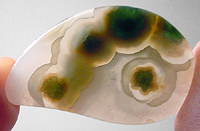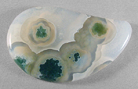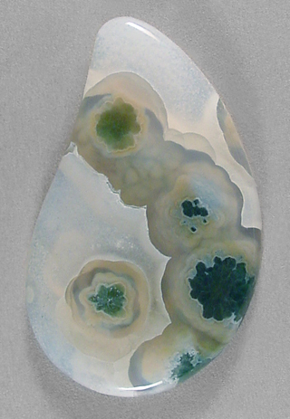 Offered here is a striking ocean jasper cab. This translucent Madagascar material is far more gemmy than its jaspery brethren, and features a lovely classic contrast, as well as a fascinating dimension of depth. It's beautifully patterned, with an attractive arrangement of deep green flowery bullseyes that stand out in sharp contrast against a background of snowy white, with nearly clear haloes surrounding the orbs. It'll make a delicious item of jewelry, almost effortlessly! The cab has a low dome, and a smoothly rounded designer drop shape, brilliantly polished both front and back.