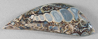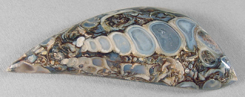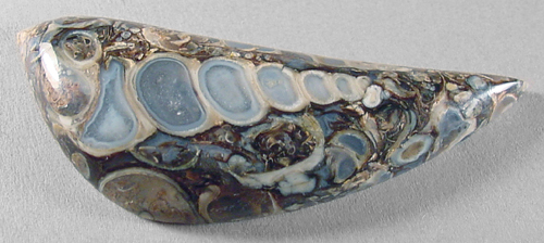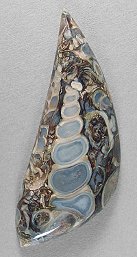 Offered here is a fascinating cabochon of turritella agate, from Wyoming. This ancient fossilized material has bunches of of turritella shells, from which it takes its name. The many white shells make a nice backdrop for the one large shell showing cells filled with bluish agate, some of which has crystalline cores like crushed ice adding sparkle. Turritella agate was never a favorite of mine until a few years back, when a rockhound friend shared some of this great old solid stuff with me. It's a joy to work with, fine enough to take an excellent shine. I'm sure you'll like it too, give it a try! The cab has a high rounded dome of 7mm, and a designer drop shape that's polished both front and back.