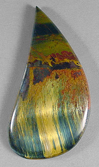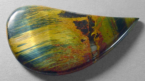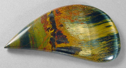 Offered here is a cabochon of rare Marra Mamba tigereye, from Australia. This covetted material is quite chatoyant, with a bright rolling flash you just can't miss, even in these flat digital photos. The colors are blue and golden yellow, which blend into a more greenish shade. The metallic patch and bands going across the stone are actually quite shiny to the eye, though the camera records them as being dark. The jasper that's present is also rather colorful, including areas that are orange, olive green, blood red, and dark midnight blue. It's an awesome example anyone would be proud to own. The stone has a nicely rounded dome of 4mm, a designer teardrop shape, and an excellent glassy polish both front and back. My per carat price is a steal of a deal!