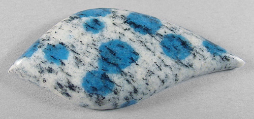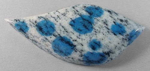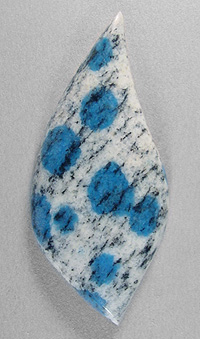 Offered here is a cabochon cut from K2 blue jasper, from Pakistan. This rather exotic new gem material is so named because it was mined at the base of the highest peak in that part of the country, K2, second in height only to Mt. Everest. This example has an attractive showing of azurite blue spots that contrast beautifully against an off-white granitic background. If you like featuring the truly unusual in your creations, you're going to love this stone! It has a well rounded dome of 6mm, a curvy designer 'flame' shape, and a slick glassy polish both front and back.