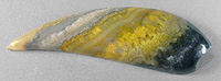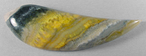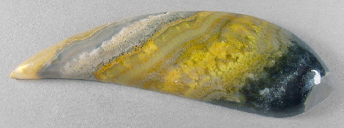 Offered here is a striking cabochon of bumble bee stone, from Indonesia. After slicing some of this extraordinary material in my slab saw, it simply isn't hard enough to be either a jasper or an agate. Once polished, it has a somewhat waxy feel, a lot like onyx does. For sure, it cuts FANTASTIC cabs! This example has a variety of bands, in shades of brilliant yellow, white, grayish and mottled black, which adds an appealing contrast. The widest bands are composed of interesting plume-like figures. I read on the importer's website that this material is harvested near the steaming calderas of Mount Papandayan, an active volcano, where locals collect native sulfur! So that seems to explain the vivid yellow colors. The cab has a nicely rounded dome of 6.5mm, a designer 'flame' shape, and a slick glossy polish both front and back.