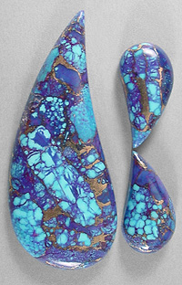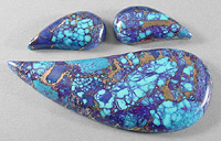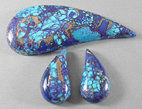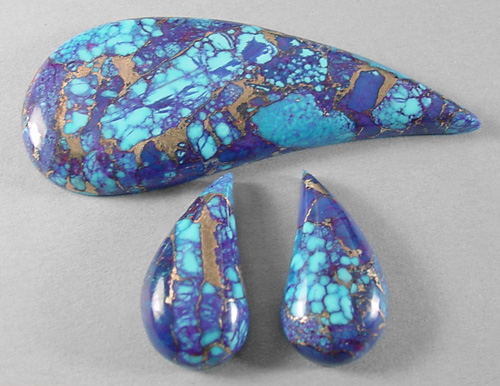 Offered here is a matching trio of cabochons of Mohave purple turquoise. My cousin purchased a block of this vividly colored material from the nice folks who mine Kingman turquoise in Arizona again this year. I have to say the bluish purple colors are even MORE captivating than before. It is composed of small chunks of natural blue turquoise (some spiderwebbed), to which they added red dye and a brassy-bronze metallic. From there, I'm told the proprietary process is very much the same as with other stabilized turquoise, using a combination of heat and compression, and this is the end result. Beautifully rich coloration, with contrasting golden metallic webbing through and through. Even though this purple turquoise isn't natural, either in color or form, I find it to be absolutely gorgeous. It cut like a dream, took a fantastic polish, and is totally solid. And the VIVID colors certainly command attention! Each of these three stones has a rounded dome of 5mm, and a well matched designer teardrop shape, polished to a glossy brilliance front and back.