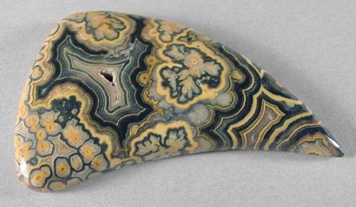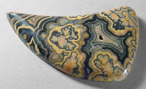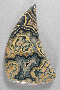 Offered here is a cabochon of top quality flowering tube onyx, from Utah. This unique material is simply stunning in its complex and varied patterns. This strikingly exotic example has flower-like plumes, bullseyes and scalloped bandings, with contrast to spare. And an interesting crystalline void framed by fortifications. The yellow, ochre, gray and black hues of this type of onyx somehow remind me of Autumn, but this one will get noticed no matter what the season. It's awesome stuff! Happily, there are next to none of the typical healed hairlines that often plague this rare onyx. The stone has a low rounded dome, a versatile designer shape, and a smooth glossy polish both front and back.