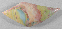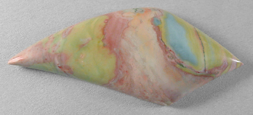 Offered here is an extra special cabochon of crayola jasper, from Nevada. The material was aptly named because it really does have the appearance of a box of melted crayons. This example features an attractive pattern in both pastels and richly colorful shades too numerous to name off. It has a well rounded dome of nearly 5+mm, a designer 'flame' shape, and a brilliantly glassy polish both front and back.