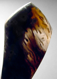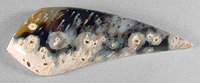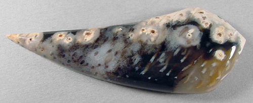 Offered here is a splendid cabochon of rare petrified palm wood, from Texas. This ancient fossil material is a joy to work with, showing none of the typical pits and chalky soft spots this petrified wood so often has. The speckled figure of the once-living palm is still apparent here, but what really catches the eye is the wood's unusual colors, patterning, and the strong contrast between them. It's not often you find such good quality pet. palm showing gemmy translucence, eyes, tubes, and shades of cream, gray, tan and jet black all in the same piece, so I took extra care to shape the cab to make the most of everything it had to offer. No pet wood collection is complete without an example of palm wood, and this one is will do ya proud. The cab has a gracefully curved designer shape, a well rounded dome of 6mm, and it is perfectly polished both front and back.