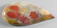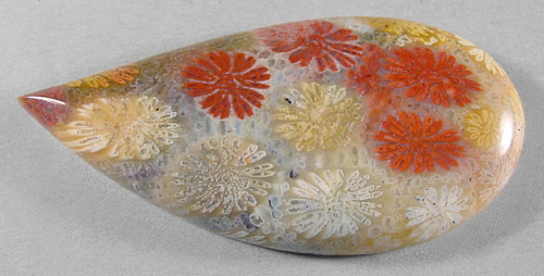 Offered here is a large deluxe cabochon of colorful fossilized coral, from Indonesia. Much of this fascinating material can be drab or monotone, so good, solid pieces with strong hues are few and far between. Recently I read that there's next to no fossil coral being found these days, as the deposits have all been depleted. Anyway, this example has startlingly rich crimson red, pink and goldenrod yellow areas, plus some beige and white figures. Even without enlarging the pics, one can clearly see the stone's unmistakeable one-of-a-kind pattern of flower-like starbursts. Hence the name 'flowers of the sea', as it is sometimes known. It is actually composed of the highly silicated fossil remains of colonial sea coral, many millions of years old! Please click to enlarge the pics to see the intricate details within. This cab has a high rounded dome of 6mm, a plump designer drop shape, and a slick glassy polish both front and back.