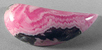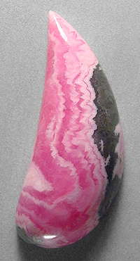 Offered here is a cabochon of rhodochrosite, from Argentina, cut from scarce old stock material. Not easy to come by like it once was, last I heard, the price of classic rhodochrosite is strictly controlled by the Argentinian goverment. -grr- This magnificent stone features lovely pink coloration, with sharply contrasting dark silvery metallics. Some of the bands have intricate dogtoothed spikes in palest pink pastels. I'm told the metallic ore area probably contains at least some precious silver content, and as hinted at in the pics, reflected light reveals that it has interesting moire patterns to it, too. This beauty has a designer teardrop shape with a well rounded dome of 7.5mm, polished to a lustrous gloss both front and back.