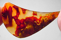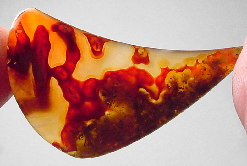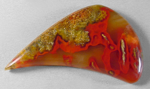 Offered here is a yummy cabochon of Moroccan agate, showing outstanding color and figure. The crimson red swirls through the warm golden areas, and there are some unusual, almost windblown, tubes containing bundled mosses. The stone exhibits a lovely degree of translucence, as illustrated by the backlit photo; please feel free to click to enlarge the pics to view extra details. There's quite a lot going on in this dramatic stone, and it ought to look grand in even the simplest of settings. It has a low rounded dome of 4mm, and a curvy designer drop shape, polished both front and back.