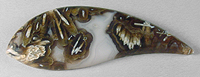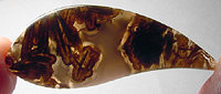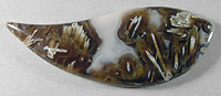 Offered here is an impressive cabochon of Cubuk needle agate, a relatively recent addition to the lapidary world, which hails from Turkey. This example boasts a fascinating pattern of tubes, in white, that resemble cut straws, contrasting nicely against a translucent background the color of root beer, with subtle greenish undertones. Through the middle of the stone, there's a patch of white with ghostly fortifications, with another tiny bullseye tube. The cab has a low but nicely rounded dome of 5mm, a sweet designer 'flame' shape, and a smooth glassy polish both front and back.