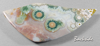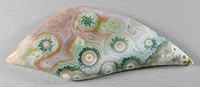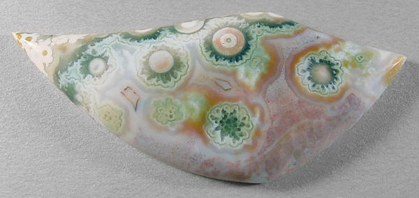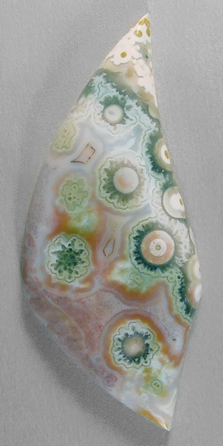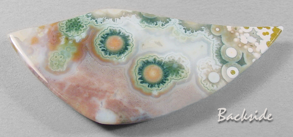Offered here is large, deluxe cabochon of ocean jasper, from Madagascar. This unique cab has a decidedly festive, upbeat quality to it, entertaining the eye with an impressive array of extra fancy bullseyes of various sizes and colors. A close look reveals that the largest orbs are ringed with tiny pseudomorphs of green crystals, making them look like little cogwheels or flowers. And they contrast beautifully against a background of coral, pink and white, with subtle fortifications. The backside is splendid too, so an open-backed setting would be just the ticket. The stone has a nicely rounded dome of 5.5mm, and a sweet designer 'flame' shape that's polished both front and back.