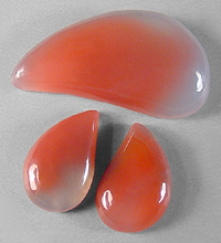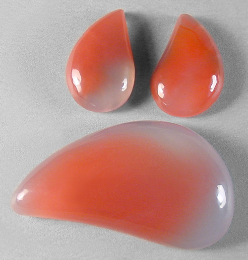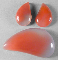 Offered here is a delightful suite of three matching cabochons of rose agate, which hails from Mozambique, Africa. Great name for this chalcedony because it obviously has beautiful rosy pink colors. These jelly-like examples have saturated hues of pinkish-orange, and only the merest hint of banding. Each of the three shows lovely translucence, as illustrated by the backlit photo. I think you'll do great things with these vibrant beauties; give 'em a try and see! The large stone has a well rounded dome of 7mm, while the smaller pair are 4mm in thickness. Each stone has a plump designer drop shape, and a super glassy polish both front and back.