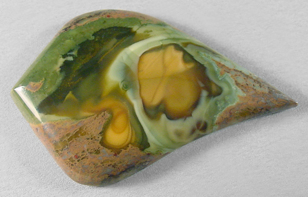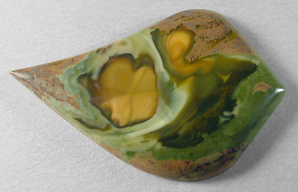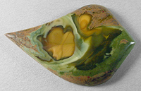 Offered here is a cabochon of cabenite, also called royal eyes jasper. It was found years ago in an area near McDermitt, on the Nevada/Oregon border, in thunderegg form. The fellow who mined them has been offering some small (& rather expensive) slabettes at the Madras gem show for a few years now. Every stone I've cut from this jasper has been one of a kind, but this example has an even wilder array of patterns and colors than those others. So much so, that I'm going to have to rely on the photos to describe it! Reminds me a little of Bruneau jasper, and also bears a resemblance to some Morrisonite and Willow Creek jaspers, but this attractive combination is unique to royal eyes jasper. Have FUN with it! The stone has a low rounded dome, and a whimsical designer 'flame' shape that's highly polished front and back.