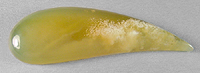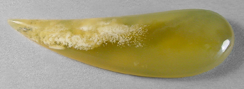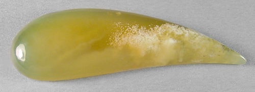 Offered here is a cabochon of lovely yellow opal. I suspect this originated near Napa, California, as it seems exactly like some other opal I have from that source. This material is deemed "common" opal because it has no flashing rainbow of fire, but it is anything but common in the other sense of the term. This example features gemmy translucent lemon yellow coloration, with an odd pattern of sugary dots in areas of the stone. It has a nicely rounded dome just shy of 5.5mm, and a gracefully curved teardrop shape, polished both front and back.