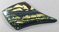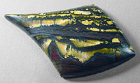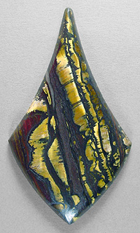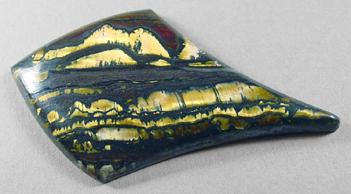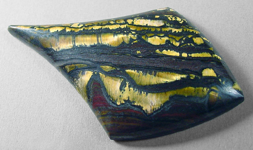 Offered here is a fancy cabochon of tigeriron, from Australia. This knockout stone has brilliant golden flashes of chatoyant tigereye, gemmy rows of windows that are intricately framed by ribbons of dark silvery metallic hematite. Add in a few broad strokes of reddish jasper and you have a truly striking example, one you may very well decide to keep for your very own. It will turn heads wherever it goes! The stone has an elegant designer drop shape you're sure to have fun with, a low but nicely rounded dome of 5mm, and a bright glassy polish both front and back.