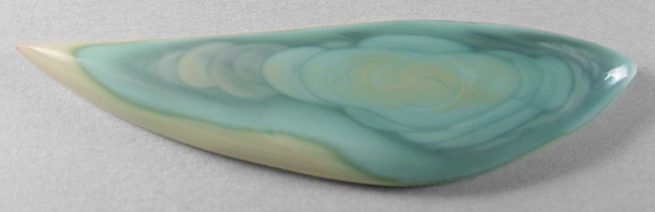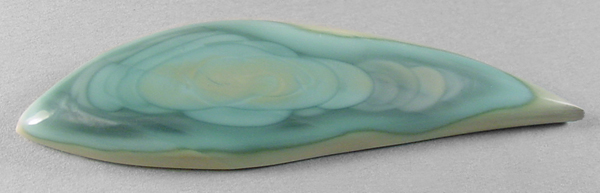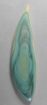Offered here is an intriguing cabochon of imperial jasper, from Mexico. This collectible 'ojitos' material is simply wonderful stuff, another member of the fine grained porcelain jasper family I love so much. (Ojitos means little eyes in Spanish.) This example features several orbicular patterns overlapping one another at center, with other rings forming the backdrop, like ripples on a pond. The colors are very attractive shades of sky to teal blues, edged with golden-green and cream, far more uncommon than most other hues. The backside is just as beautiful, so an open-backed setting would be just the thing. The cab has a rounded dome of 5mm, a long designer 'flame' shape, and a super glassy polish both front and back.